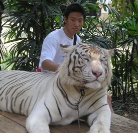 梦见宠物是只白色大老虎梦境描述:梦到我有一只宠物白色大老虎,很漂亮,但是常被“别人”叫出去玩儿,因为“别人”那里还有老虎,我很喜欢我的老虎,怕被人弄丢了,就叫它回来。我记得它叫“茂茂”,很好听的名字,哈哈,我把他叫回来时,很亲近,它太大了我只能抱着它的脖子,它也很温顺,就像普通的小宠物一样。别人也知道那白老虎是我的,还用不雅的手势指着我跟另一个人说:“我是那老虎的主人”。