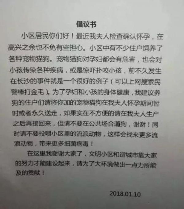 近日网络热传,安徽合肥某小区里一位业主张贴倡议书表示,因其妻子怀孕,为了孕妇和孩子的身体健康,要求小区其他住户把自家的宠物都送走……