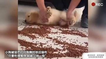 小狗被惩罚打扫狗粮时依旧偷吃,“只要吃得够快就能...