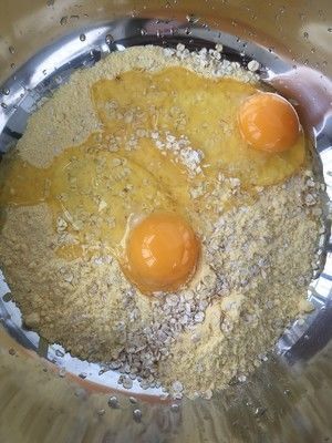 玉米面燕麦片鸡蛋牛奶倒一起混合搅拌和面!