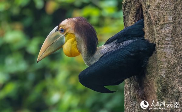 雌鸟出巢瞬间。贾雷摄人民网德宏8月23日电 8月21日,经过长期蹲守,摄影爱好者在云南省德宏傣族景颇族自治州盈江县内的“中国犀鸟谷”拍摄到花冠皱盔犀鸟雏鸟出巢的影像。