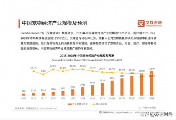 从市场规模看,《2025年中国宠物行业白皮书》数据显示,2024年中国城镇犬猫消费市场规模达到3,002亿元。《2024-2025年中国宠物行业运行状况及消费市场监测报告》(艾媒咨询)显示,2023年中国宠物经济产业规模达5928亿元,同比增长20.1%;2028年市场规模有望达到11500亿元。