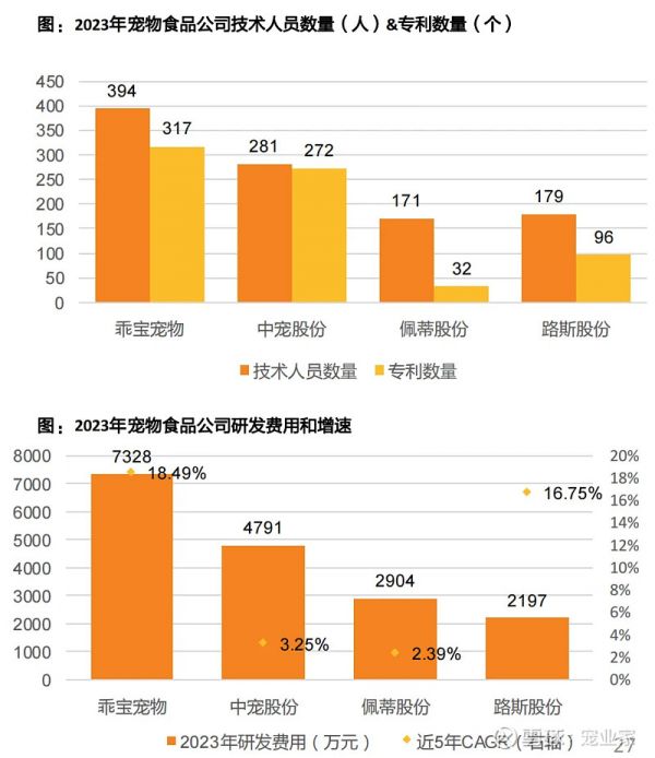 以上市公司为例,乖宝宠物研发中心创建于2007年,并在泰国设立研发分中心。2023年,乖宝研发中心拥有技术人员394人,包含各类研究开发人员74人,研发费用达到7,328万元。截至2023年12月31日,公司已获境内授权专利317项,其中发明专利14项、实用新型专利31项、外观设计专利272项。2023年,乖宝宠物营养研究院上海研发中心投入运营。