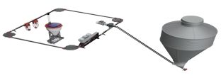 2. 气动送料系统。以压缩空气为动力,实现颗粒饲料、粉料和液态料步进输送系统(图2),根据送料形式分为推料式气动和拉料式气动。该系统可实现远距离输送,输送高度可达500m,输送速度2~10m/s,气料比30以上,倾角可达18°以上,输送量每小时5~8t,具有输送量大、输送速度快、输送密闭性好的特点。但颗粒饲料破碎率较高,粉尘污染较严重,噪音较大,耗能、成本较高。