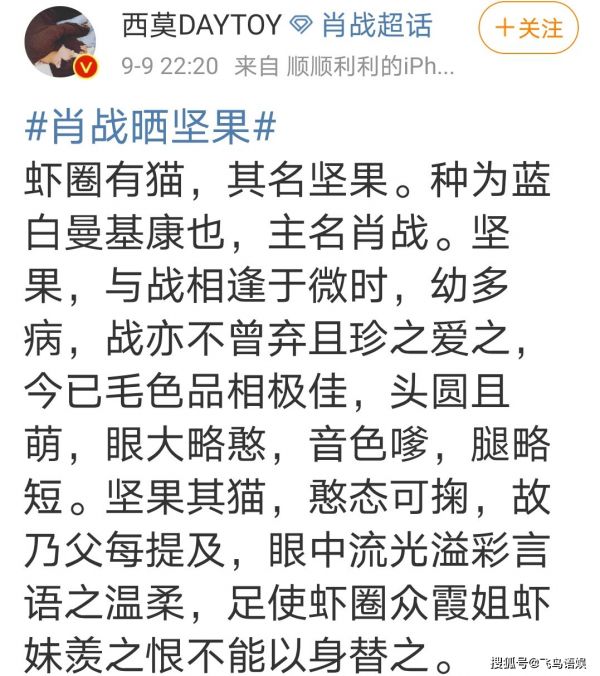 整首诗的亮点在于,最后一句“虾圈众虾姐恨不能以身替之”,而“诗”的开头又以猫的口吻叫肖战主人,果然是虾圈,连脑回路都跟骨骼清奇。