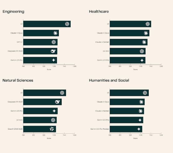 据Ai2介绍,o3对文献的阐述更为细致,工程学科方面的输出内容也更专业。其余模型的表现因学科而异,例如Claude 4 Opus在人文社科、工程学和医疗健康方面排名第二,DeepSeek R1在自然科学方面排名第二,Gemini 2.5 Pro在自然科学方面排名第三,在工程学和医疗健康方面排名第五。