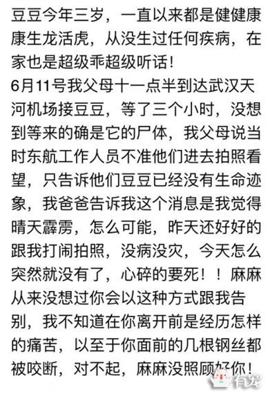豆豆主人的父母在武汉天河机场足足等了三小时,等来的却是豆豆的尸体,而且东航的工作人员禁止进去拍照看望,只告诉豆豆在开舱门的时候已经没有了生命迹象。