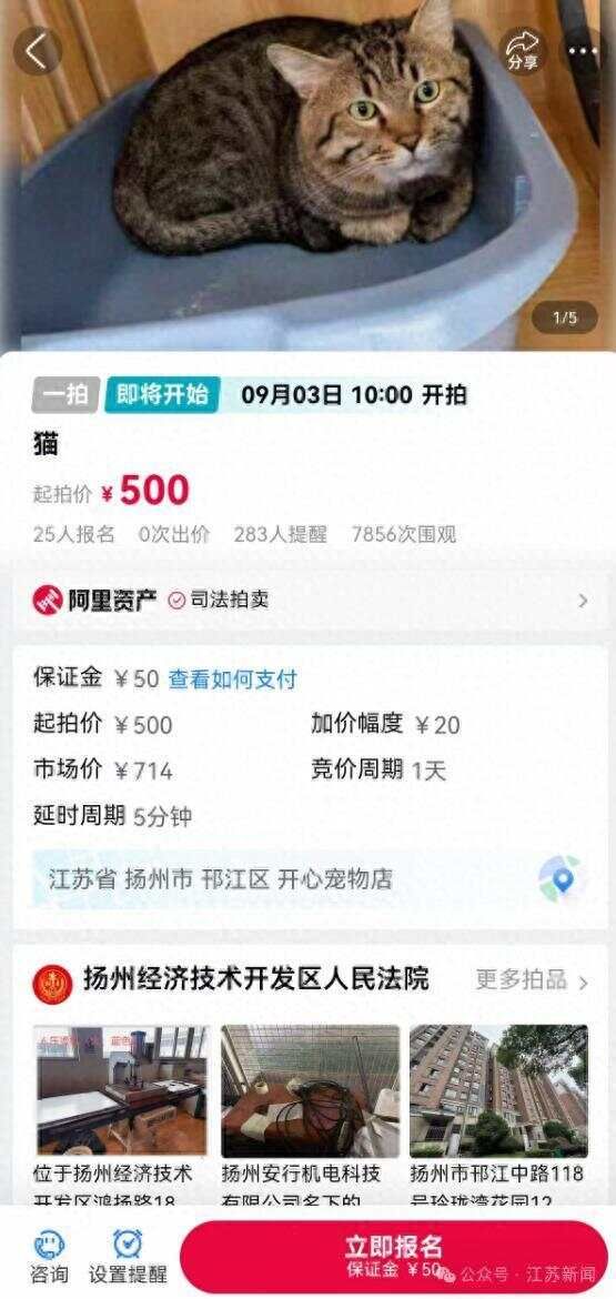 “已被本院扣押在开心宠物店!”扬州一小猫被法拍起拍价500元,咨询公司:市场价