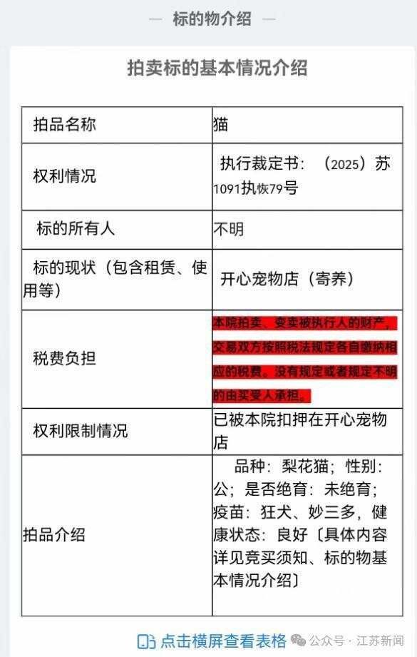 拍卖信息显示:这只3岁的狸花猫为公猫,已打两种疫苗,未绝育,健康状态良好,“已被本院扣押在开心宠物店”。拍卖将于9月3日上午10点开始。