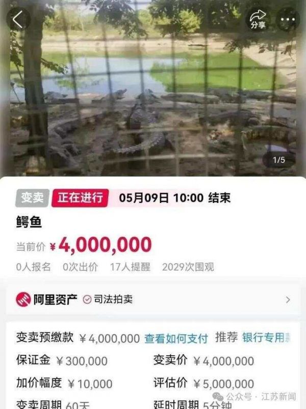 朱巧玲还提到,今年3月,深圳市南山区人民法院在阿里资产平台上对100吨活体鳄鱼进行拍卖,起拍价高达400万元。除了拍卖物品非常特殊,当时还因需要“自行承担抓捕、称重、装卸、运输等工作及费用”引发了大量网友关注。