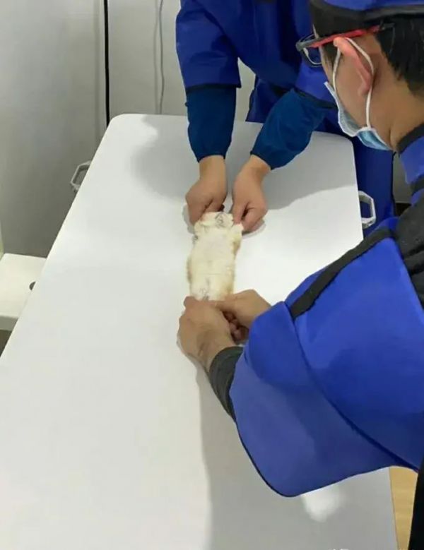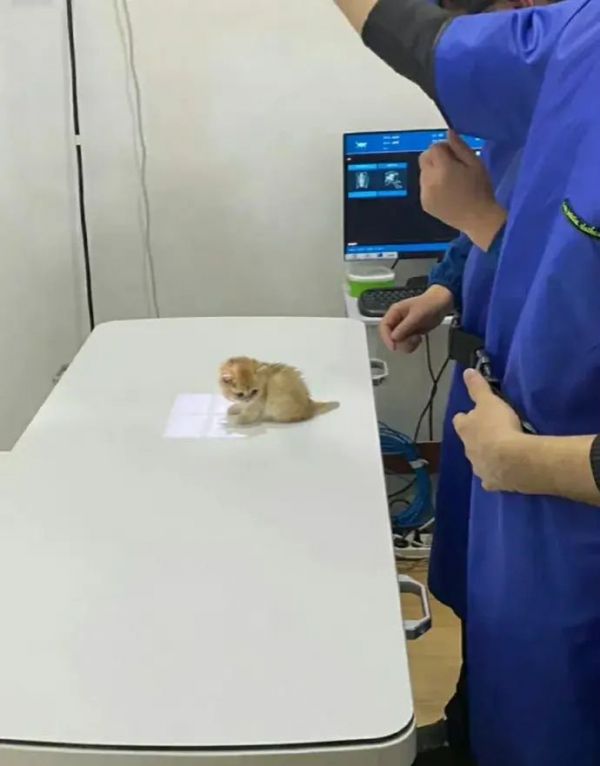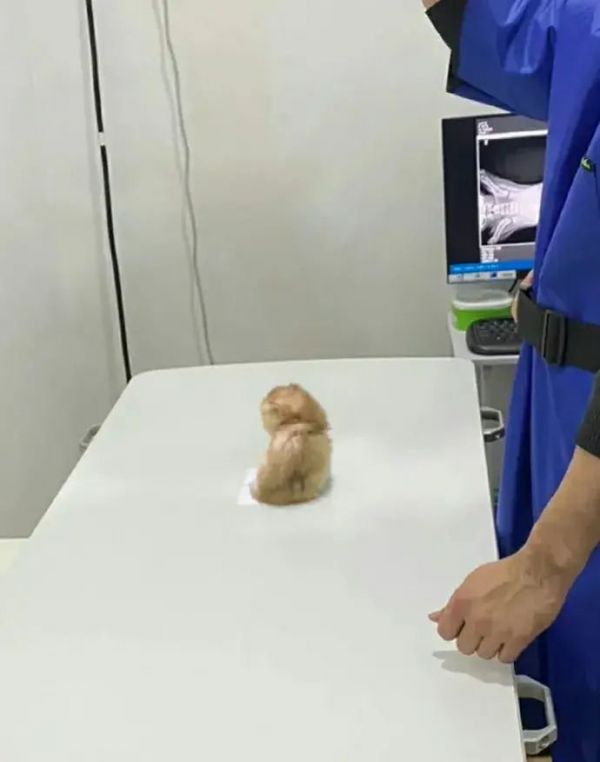 一只金渐层小猫生病了,去宠物医院照片。医生说:“这是我拍过最小的猫了”。