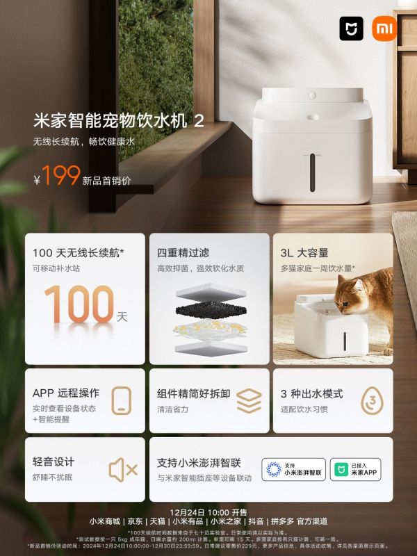 12 月 24 日,米家智能宠物饮水机 2 宣布上市,新品首销价定位 199 元。