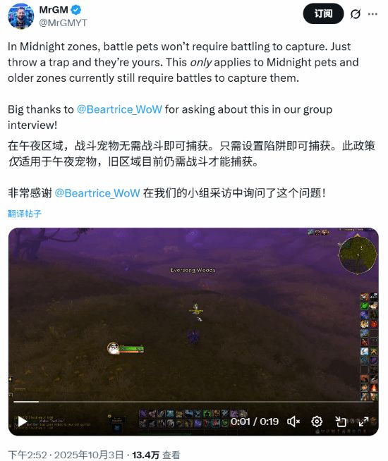 然而,在"午夜"版本的Alpha测试中,玩家发现无法与野生宠物战斗,右键点击会直接将其捕获至背包。这些新宠物既无法升级,也无法参与任何形式的宠物对战。游戏总监Ion Hazzikostas在群访中证实,未来玩家仍可收集宠物,但战斗部分将被取消,原因是参与该玩法的玩家数量有限。