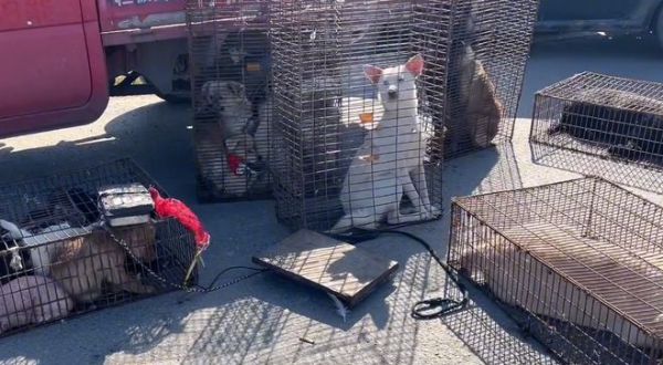 在狗肉车旁,已经有不少的狗被装进了笼子里