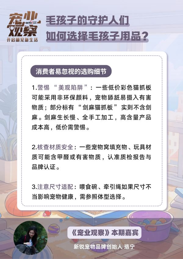 央视网消息:毛孩子家长们看过来,给毛孩子挑生活用品时,这些“隐藏关卡”你遇到过吗?一些号称“剑麻材质”的猫抓板竟然是劣质纤维冒充,喂食碗高度没选对让毛孩子脖子不舒服……选购宠物用品需注意哪些细节?怎样的设计能让你和毛孩子的互动更亲密?