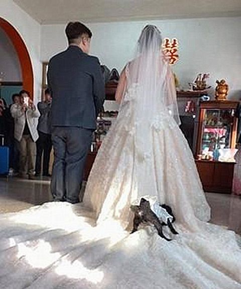 转过头一看顿时笑不出来,原来是自家的狗正躲在身后踩在婚纱上打滚呢。大家纷纷被狗狗的举动逗乐了:别添乱了。看狗狗也穿着小礼服,想必也是要在主人重要的这一天出镜的吧,不过此刻狗狗的行为,似乎在表达:我反对这场婚姻!