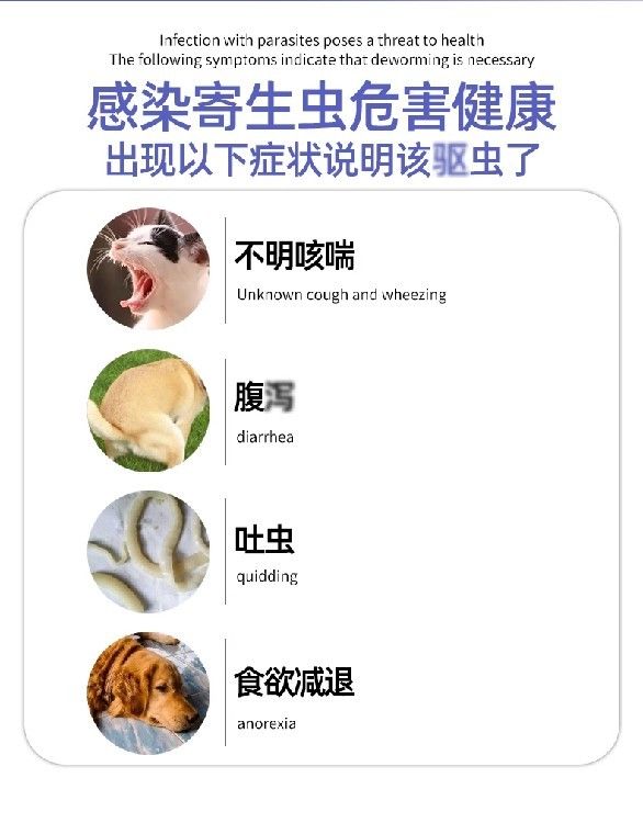 严重的肠道寄生虫感染会导致宠物出现腹痛、腹胀等不适症状,表现为弓背、不愿触碰腹部、或发出痛苦叫声。我们的驱虫产品通过清除肠道内寄生虫及其代谢产物,能有效减轻肠道炎症和痉挛,从而缓解腹痛和腹胀,恢复肠道舒适感。