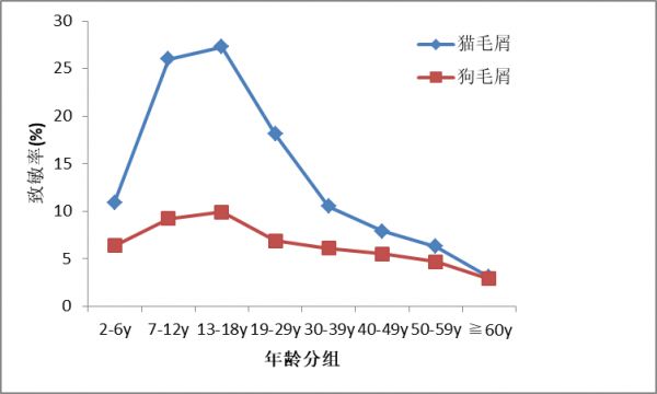 猫毛皮屑过敏的人年龄小于狗毛皮屑。13-18岁年龄组猫狗毛皮屑的致敏率最高,其次为7-12岁年龄组。猫毛和狗毛的致敏年龄分布特点和其他吸入性过敏原如尘螨和花粉不同。前者致敏高峰期在儿童和青少年时期,后者致敏高峰期在青壮年时期。这可能与过敏患者与吸入性过敏原接触时间和强度有关。尘螨及花粉过敏的患者中,青壮年致敏率最高,其次为中年人、青少年,儿童和老人致敏率相对较低。儿童和青少年由于喜爱宠物,和其亲密接触的时间相对较长,因此致敏率较其他年龄组更高。