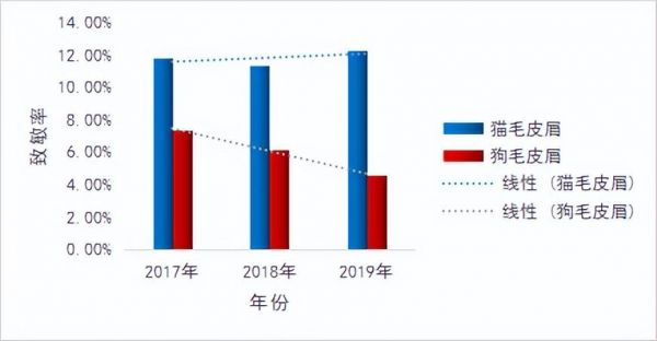 北京世纪坛医院的研究显示2019年猫毛皮屑致敏率为12.3%,均较2017年的11.8%和2018年的11.4%上升。狗毛皮屑致敏率由7.4%下降为4.6%,呈现下降趋势。猫狗毛皮屑致敏率之间的差异随着年限的递增而递增,由4.4%增加到7.7%。这可能与本中心回顾性研究的人群有关,多数就诊患者来自城市地区,家庭中饲养猫的几率更高,因此与猫毛皮屑接触的机会增加从而导致其致敏率增加。而狗毛皮屑致敏率的下降,一方面与城市养狗人口减少有关,一方面与狗的微生物组对过敏的保护作用有关。