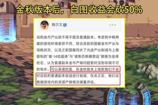 其次,能搬砖的玩家最好趁这2个月多搬一点,梅尔文策划曾说过,不会在金秋版本前对金币收益缩减,也就是说大概率会在金秋版本缩减,根据韩服实装来看,白图收益会缩减掉50%,也就是说只有100万左右了。
