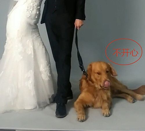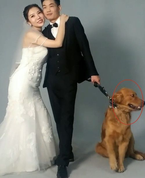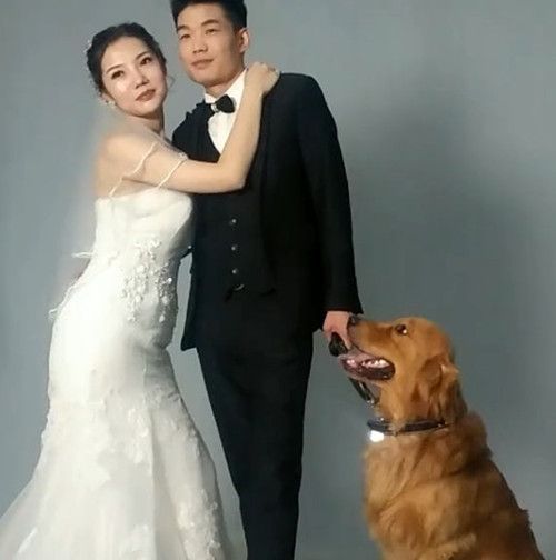 原来金毛的主人要和女友结婚了,这不也想让金毛参与进来嘛,于是情侣俩就想着把金毛带着一起去拍一组婚纱照吧,这样的婚纱照也能和那些千篇一律的照片有所不同。于是二人也不问金毛愿不愿意,直接就将它捎上了。