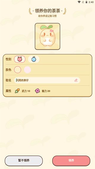 1、进入软件内,先领取一只宠物,给它取名并选择它的性别和肤色