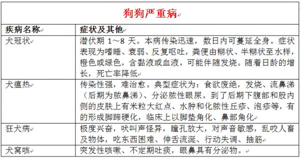 好了,关于细小病,兽医小明就科普到这里了。兽医小明想说,既然带狗狗回家了,就要对它负责。生病了及时治疗是有治愈的可能性的。下面是兽医小明为大家整理的表格,关于狗狗常见严重病的症状。
