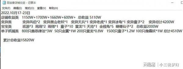 梦幻西游中有一部分玩家会选择在商会中开店来赚钱或者储备金,上面的,这位玩家开的是师门宠物店,这位玩家开了门宠物店后七天赚了1.5亿的梦幻币,这里面有一部分是店铺收益,有一部分是帮别人抓召唤兽获得的收益,还有一部分是补店的过程中碰到的变异召唤兽,这位玩家七天碰到了价值4200万的变异召唤兽呢,难道现在变异的产出几率这么高了吗?小编以前的时候在一周内也很难碰到一只变异呀!