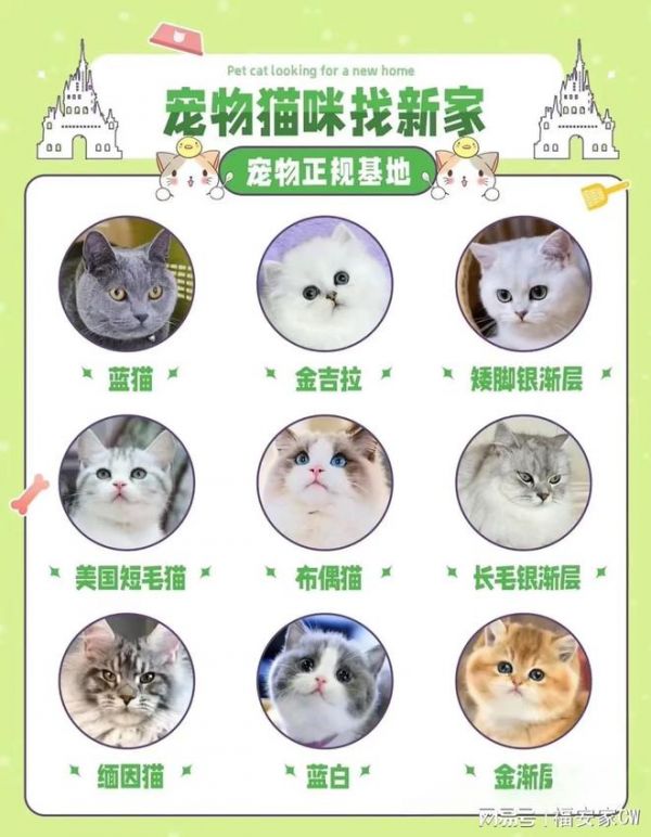 在售猫咪品种:蓝猫,金渐层,布偶猫,蓝白,蓝金,银渐层,蓝金渐层,美短猫,起司猫,银点,金点,缅因猫,曼基康,米努特,德文等