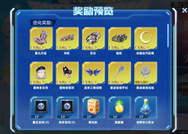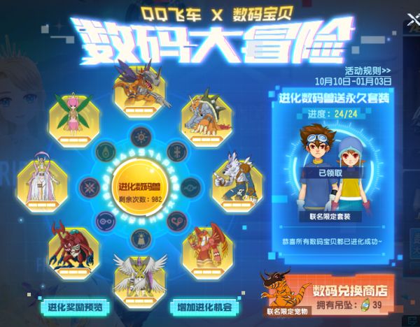 1. 活动期间,赛车手们可通过完成指定任务来获得进化机会。每次进化都可获得随机奖励,每进化三次必定可会进化成功一次,没有进化成功还可以获得“吊坠”补偿。当玩家把全部8个数码宝贝全部进化至终极形态后即可获得数码宝贝联动限定套装“八神太一/武之内素娜套装”。