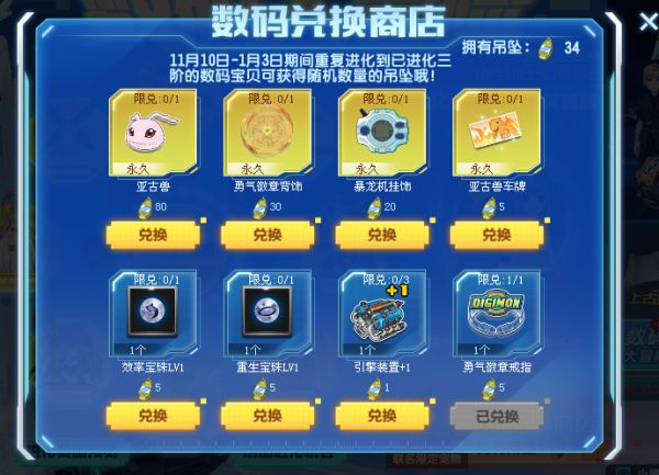 2.玩家在活动期间,进化到已经进化至终极形态的数码宝贝后,除了获得随机奖励之外,还可以获得随机数量的“吊坠”,收集吊坠可在兑换商店中兑换数码宝贝联动宠物“暴龙兽”和IP联动的配饰等。