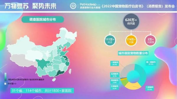 《中国宠物行业白皮书——2022年中国宠物医疗消费报告》的调研数据来自31个省、114个城市(其中一线城市占比28.8%,新一线城市37%,二线城市22.6%,三线城市8.3%,四线城市2.6%,五线城市0.7%),共计1800+家医院,调研病例量高达620万+。