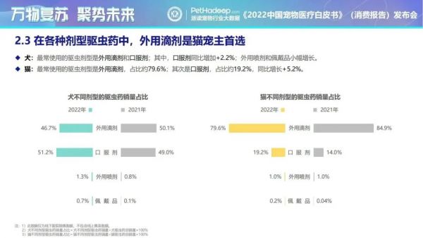 犬:最常使用的驱虫剂型是外用滴剂和口服剂;其中,口服剂同比增加+2.2%;外用喷剂和佩戴品小幅增长。