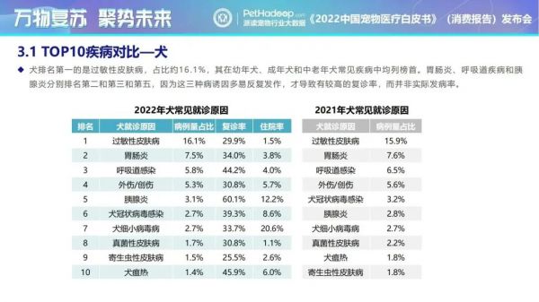 在2022年犬常见就诊原因中,排名第一的是过敏性皮肤病,占比约16.1%,其中在幼年犬、成年犬和中老年犬常见疾病中均列榜首。胃肠炎、呼吸道疾病和胰腺炎分别排名第二、第三和第五,因为这三种病诱因多易反复发作,才导致有较高的复诊率,而非实际发病率。