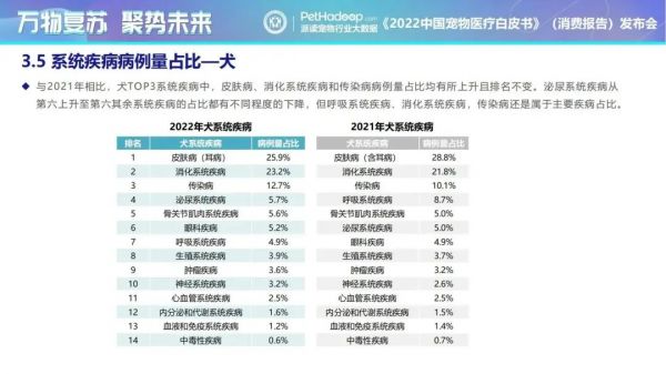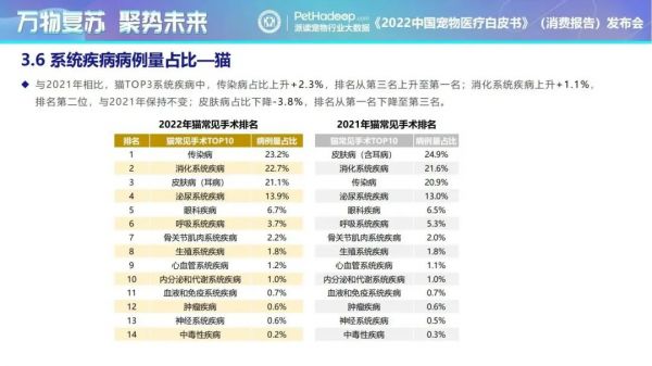 与2021年相比,猫TOP3系统疾病中,传染病占比上升+2.3%,排名从第三名上升至第一名;消化系统疾病上升+1.1%,排名第二位,与2021年保持不变;皮肤病占比下降-3.8%,排名从第一名下降至第三名。