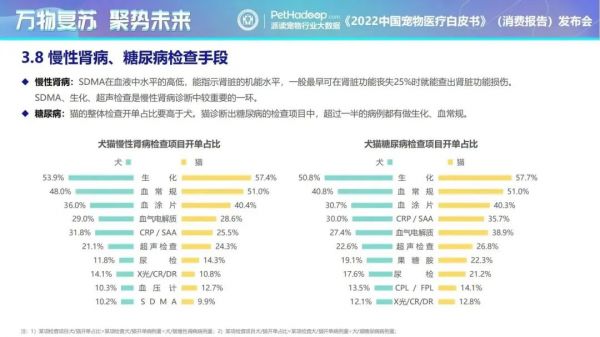 糖尿病:猫的整体检查开单占比要高于犬。猫诊断出糖尿病的检查项目中,超过一半的病例都有做生化、血常规。