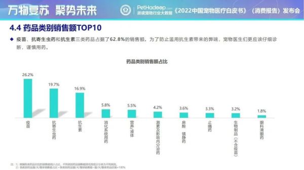 疫苗、抗寄生虫药和抗生素三类药品占据了62.8%的销售额。为了防止滥用抗生素带来的弊端,宠物医生们更应该仔细诊断,谨慎用药。