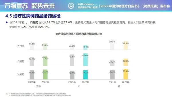 与2021年相比,口服药占比从33.7%上升至37.6%,主要是犬宠主人对口服药的接受程度更高,猫主人对出院带药的接受程度也从24.2%提升至28.0%。