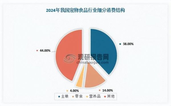 1、主粮占据宠物食品市场38%的份额,为最大的消费领域