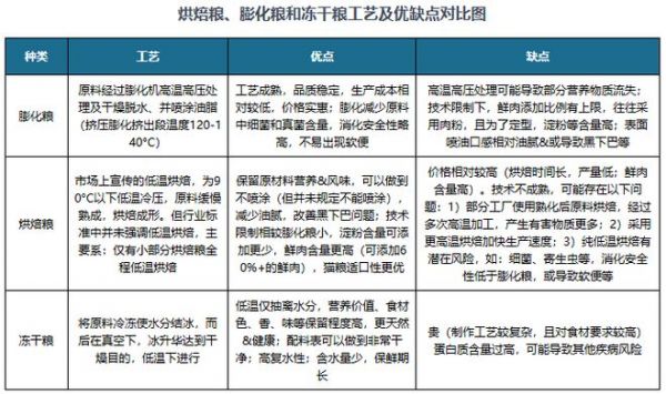 根据观研报告网发布的《中国宠物主粮行业发展深度研究与投资前景预测报告(2025-2032年)》显示,我国现有行业标准的三类宠物主粮加工工艺为:膨化粮、烘焙粮和冻干主粮,这三者品类优缺点明显。