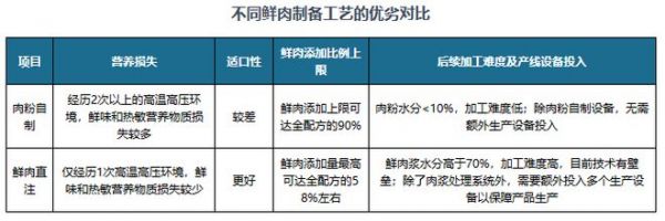 二是,鲜肉添加比例有限。根据《中国农业农村部第20号公文》规定,如宠物饲料产品使用的鲜肉原料除冷藏外未经蒸煮干燥、冷冻、水解等类似任何处理过程,且不含有氯化钠、防腐剂或者其他饲料添加剂,可声称“新鲜的”或“鲜”。为满足“鲜肉”标准,生产厂家通常采用两种肉处理工艺:肉粉自制和鲜肉直注。而鲜肉中的水和脂肪含量较高(含水量约75%),在进行挤压膨化时,会抵消挤出机筒中的摩擦,导致物料结团与变形等问题。