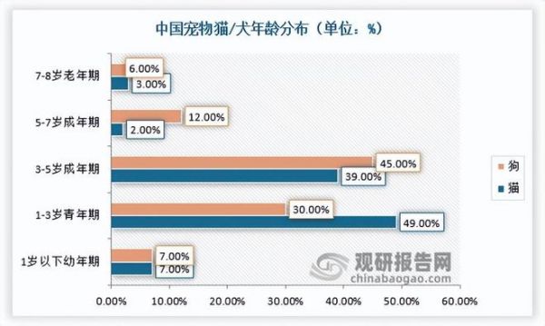 此外,根据《2024淘宝天猫宠物食品行业趋势白皮书》,2024年中国猫年龄结构仍较小,49%集中在青年期(1-3岁),39%集中在成年期(3-5岁)。但犬的年龄结构相对较高,45%集中在成年期(3-5岁),12%集中在中年期(5-7岁),6%集中在老年期(7岁+)。幼年期宠物健康问题较小,随着宠物年龄增加,泌尿、心血管等问题更显著,对处方粮&老年粮需求上升。
