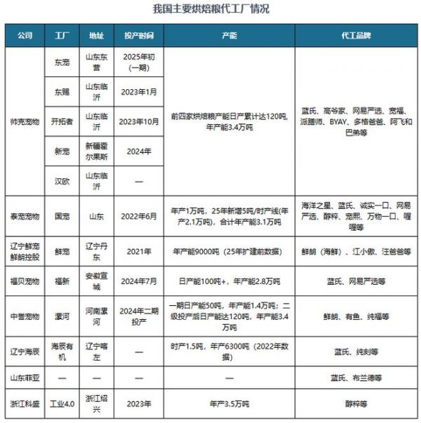 烘焙粮则是在挤出膨化工艺基础上进行改进,核心是克服膨化工艺“高温营养流失、适口性差需喷涂”及“需加入淀粉、鲜肉含量受限”的限制。在此背景下,烘焙粮品类自2021年起快速增长,并且越来越多的宠物用品品牌纷纷推出烘焙猫粮。当前,鲜朗、弗列加特(乖宝)、领先(中宠)、麦富迪barf(乖宝)品牌有自建烘焙粮产能;高爷家、蓝氏、诚实一口、江小傲、宽福、纯福、海洋之星等品牌采用代工模式切入布局烘焙粮市场,目前头部代工厂主要为帅克、泰宠、福贝、中誉、海辰、菲亚。