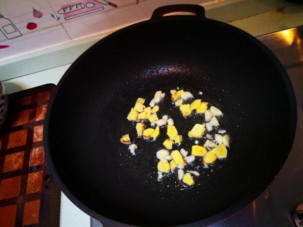 第三步 炒锅倒入油,放入姜片和蒜,爆香姜蒜。