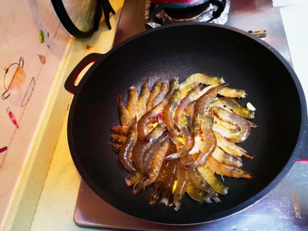 第四步 把大虾平铺在炒锅上,大虾不要重叠在一起,让大虾均匀受热,大虾同时焖熟。