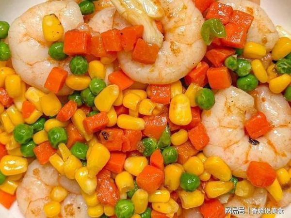 准备食材:虾仁,玉米粒,豌豆,胡萝卜丁,蒜末。