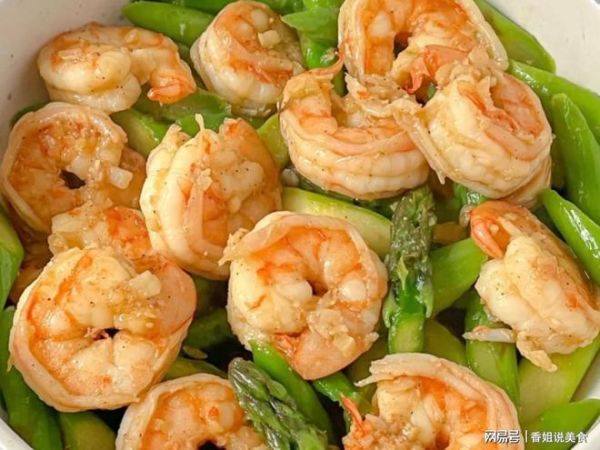 1、大虾去头去壳,开背去虾线,加入葱姜、料酒、黑胡椒粉,抓拌均匀腌制十分钟。芦笋清洗干净后切滚刀块,放入开水中焯水半分钟,沥干水分备用。