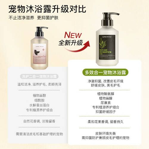 超宠爱沐浴露则更适合那些关注狗狗皮肤健康的主人。对于有皮肤敏感问题的狗狗,或者需要频繁洗澡的狗狗,这款沐浴露提供了一个安全、有效的选择。