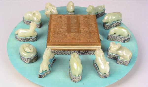 展览上展出了清代文物青玉十二生肖,此件圆雕,十二生肖造型都憨态可掬;还可以欣赏到元代的十二生肖镜,为平面圆形,小钮,圆钮为十二地支文字带,外为十二生肖像纹饰带。