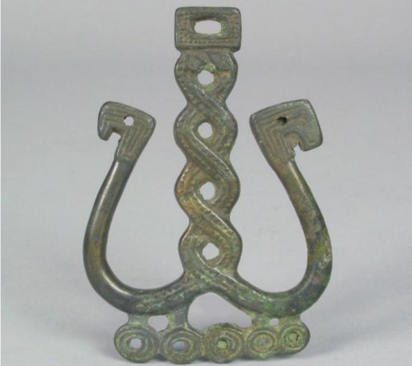 展出的春秋时期的双蛇纠结铜具,出土于辽宁朝阳十二台营子2号青铜短剑墓。这件文物整体似锚形。中间两条蛇盘曲缠绕形成四个椭圆穿孔,蛇头顶一方形系环,蛇尾与两只似凤鸟之类的动物相连,首方折,喙如钩。底足为五个联珠式装饰。通身嵌绿松石数处。这件器物推测应是一件华丽的马具,体现了北方先民重蛇、崇蛇的传统,同时也为研究东胡族的冶铸特点提供了重要的参考价值。
